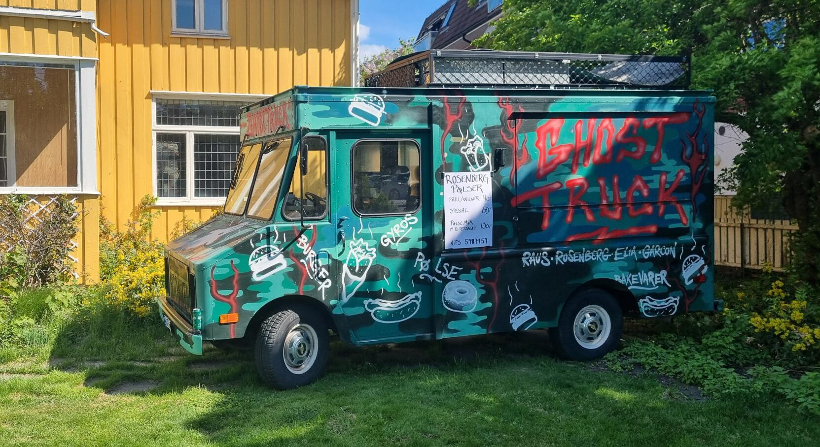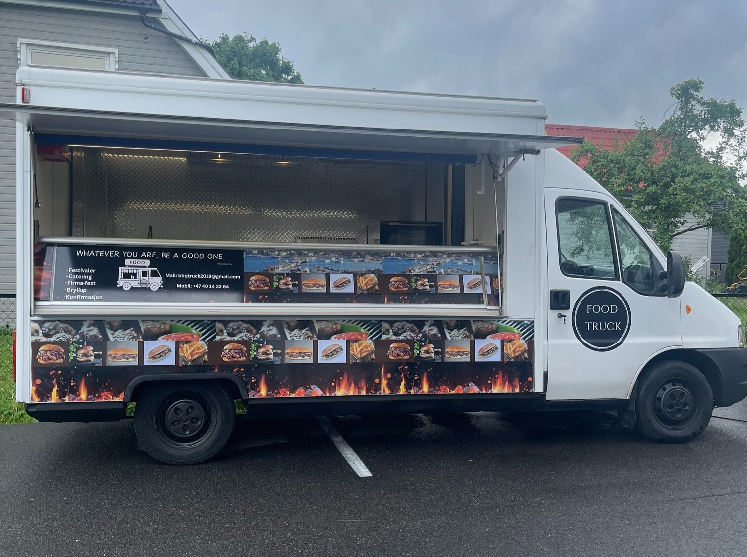 Foodtrucken fungerer som et naturlig samlingspunkt hvor gjester kan mingle og nyte mat sammen i utendørs omgivelser.