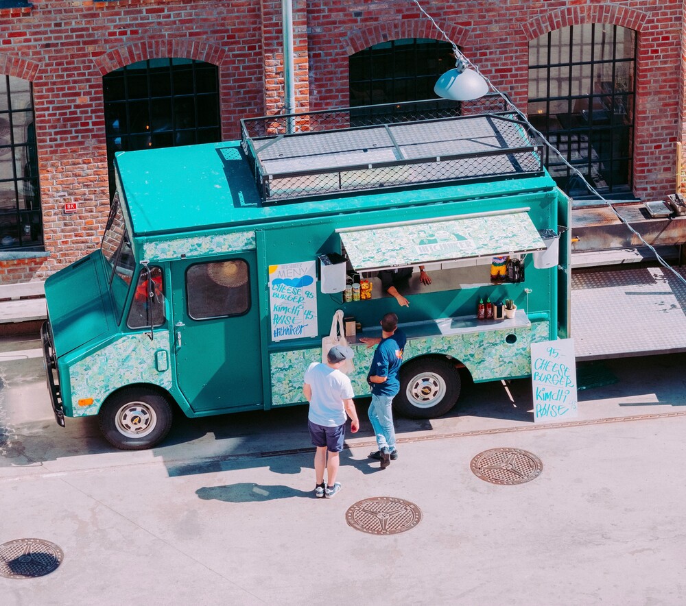 Foodtrucken fungerer som et naturlig samlingspunkt hvor gjester kan mingle og nyte mat sammen i utendørs omgivelser.